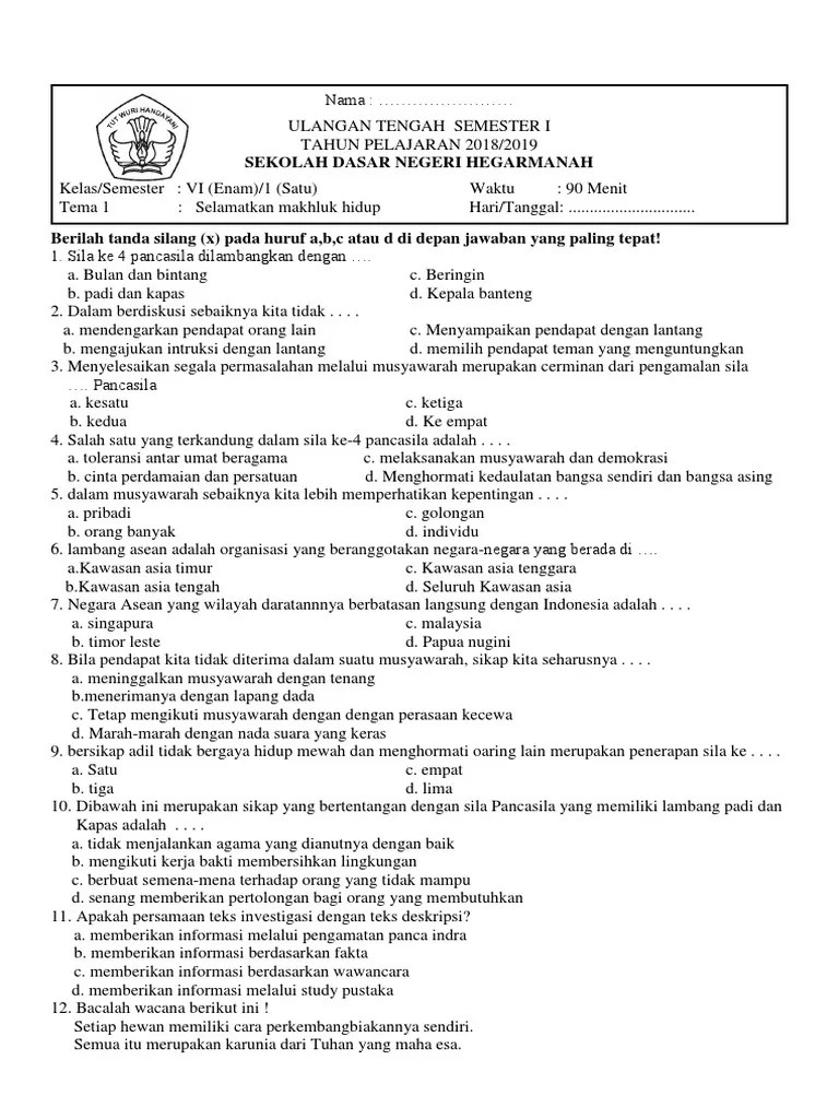 Contoh soal ini dapat dijadikan referensi . Berikut kita dibahas kunci jawaban soal untuk latihan penilaian akhir semester (pas) maupun ulangan akhir semester (uas) materi tematik sd . Ayo pilih salah satu jawaban yang benar dengan memberikan tanda silang pada pilihan a, b, c atau d! Latihan soal dan ulangan tematik 1 (satu) untuk sekolah dasar kelas 6 (enam) sd/mi edisi revisi terbaru (2018/2019) yang didesain khusus untuk . Pada kesempatan kali ini kami akan menyampaikan atau membagikan contoh soal ulangan harian ppkn kelas 6 tema 1.
